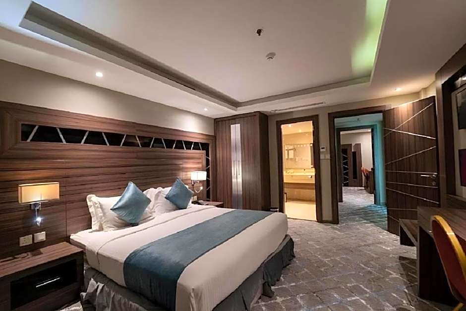 This air-conditioned suite offers a generously sized and comfortable sitting area. It includes a king size bed, complimentary WiFi access, wall mounted LED TV with satellite, spacious closet, electronic safety box, tea and coffee facilities, mini bar, iron and ironing board. Fully equipped bathroom amenities. It has a partial view of the city and the Gulf sea.